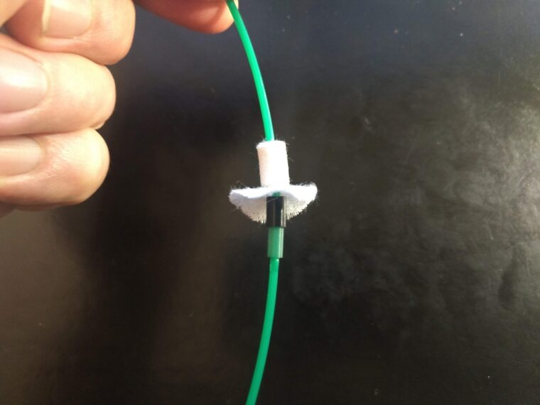 Fouling is most easily removed while the barrel is still warm. Slide on a cleaning head, pierce 1 wet patch, feed into chamber and pull straight from muzzle. Flip patch, pull again, remove wet patch. Pierce 1 dry patch, repeat. Where a range of calibers is specified for a cleaning head, a second patch can be added (stacked on top of the first) for the larger caliber to achieve a tight finishing stroke.
